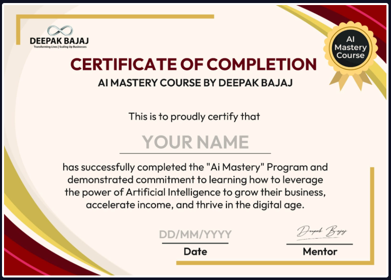 You’ll get 1-month handholding support from AI experts and access to monthly live Q&A sessions with Deepak Bajaj Experts Team. Plus, you’ll be part of our exclusive AI Business Tribe for ongoing support.